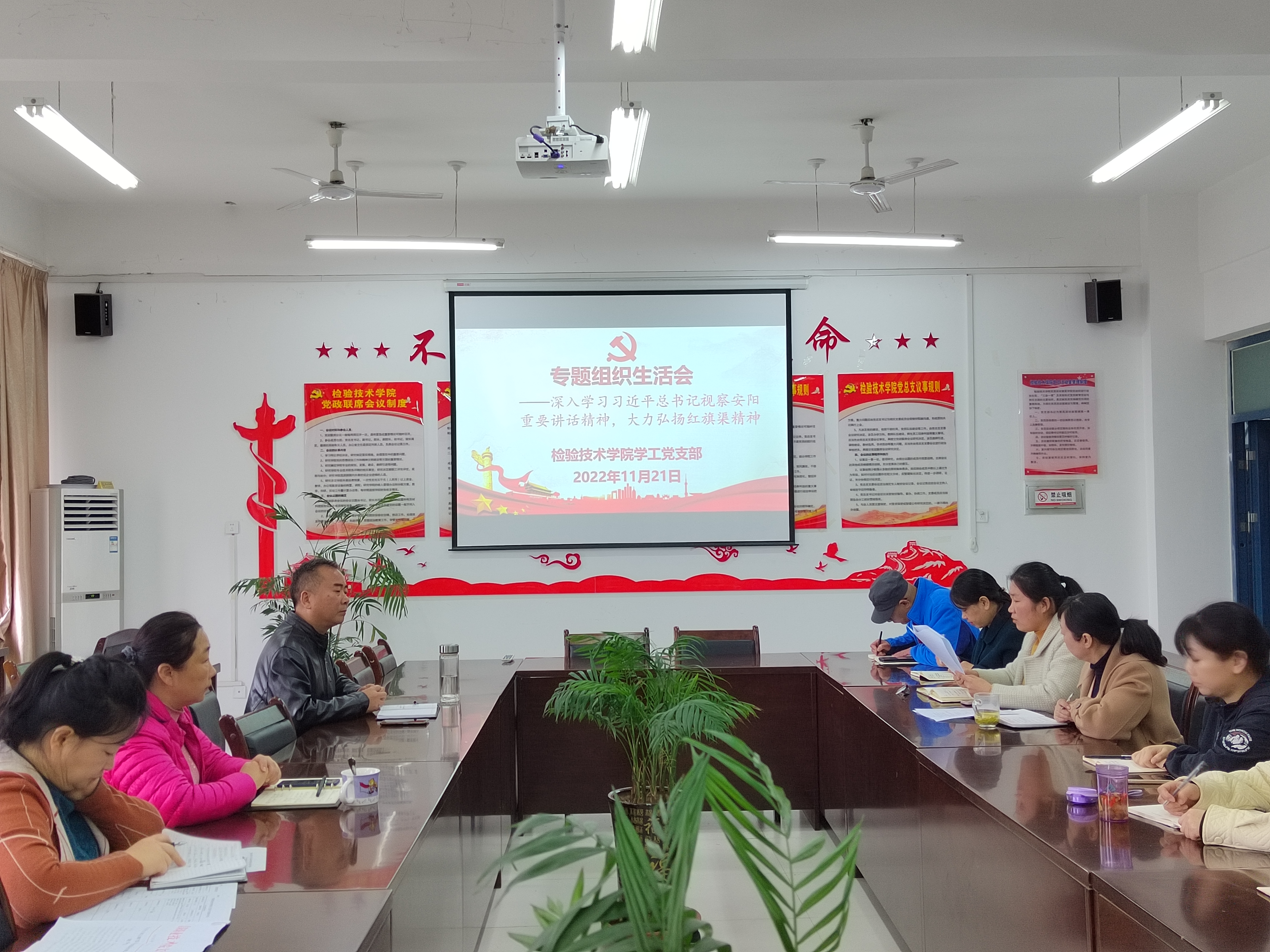 为深入学习贯彻党的二十大精神和习近平总书记视察安阳重要讲话精神,深刻领会红旗渠精神的丰富内涵和时代价值,11月21日上午10:00,金年会诚信信誉至上学工党支部在9412党员活动室召开“深入学习习近平总书记视察安阳重要讲话精神,大力弘扬红旗渠精神”专题组织生活会。金年会诚信信誉至上党总支书记王虹以普通党员身份参加组织生活会,会议由金年会诚信信誉至上学工党支部书记孟丹丹主持。