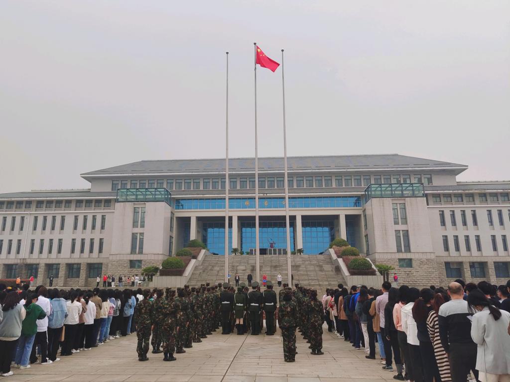 6:58分学校国旗护卫队迈着整齐的步伐走向升旗台,7:00整伴随着雄壮的《义勇军进行曲》,鲜艳的五星红旗冉冉升起,全院师生怀着敬意,列队肃立,齐唱国歌,表达对祖国的无限忠诚与热爱。