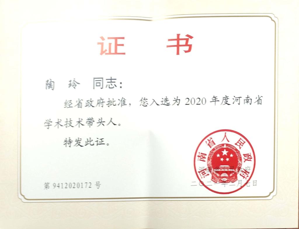 近日,河南省人民政府办公厅公布了2020年度河南省学术技术带头人名单,金年会诚信信誉至上陶玲教授喜获殊荣。