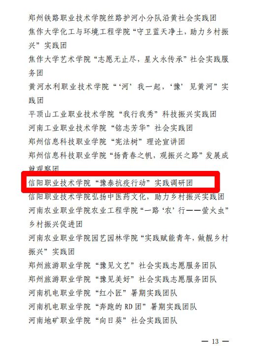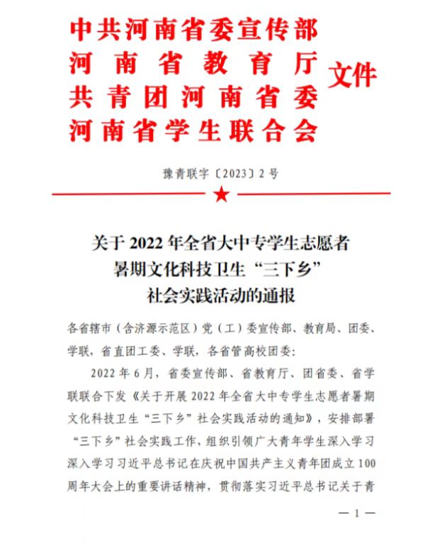 共青团河南省委办公室2023年1月17日印发《关于2022年全省大中专学生志愿者暑期文化科技卫生“三下乡”社会实践活动的通报》,其中通报表扬了100支省级“三下乡”社会实践优秀团队,金年会“豫泰抗疫行动”实践调研团榜上有名!