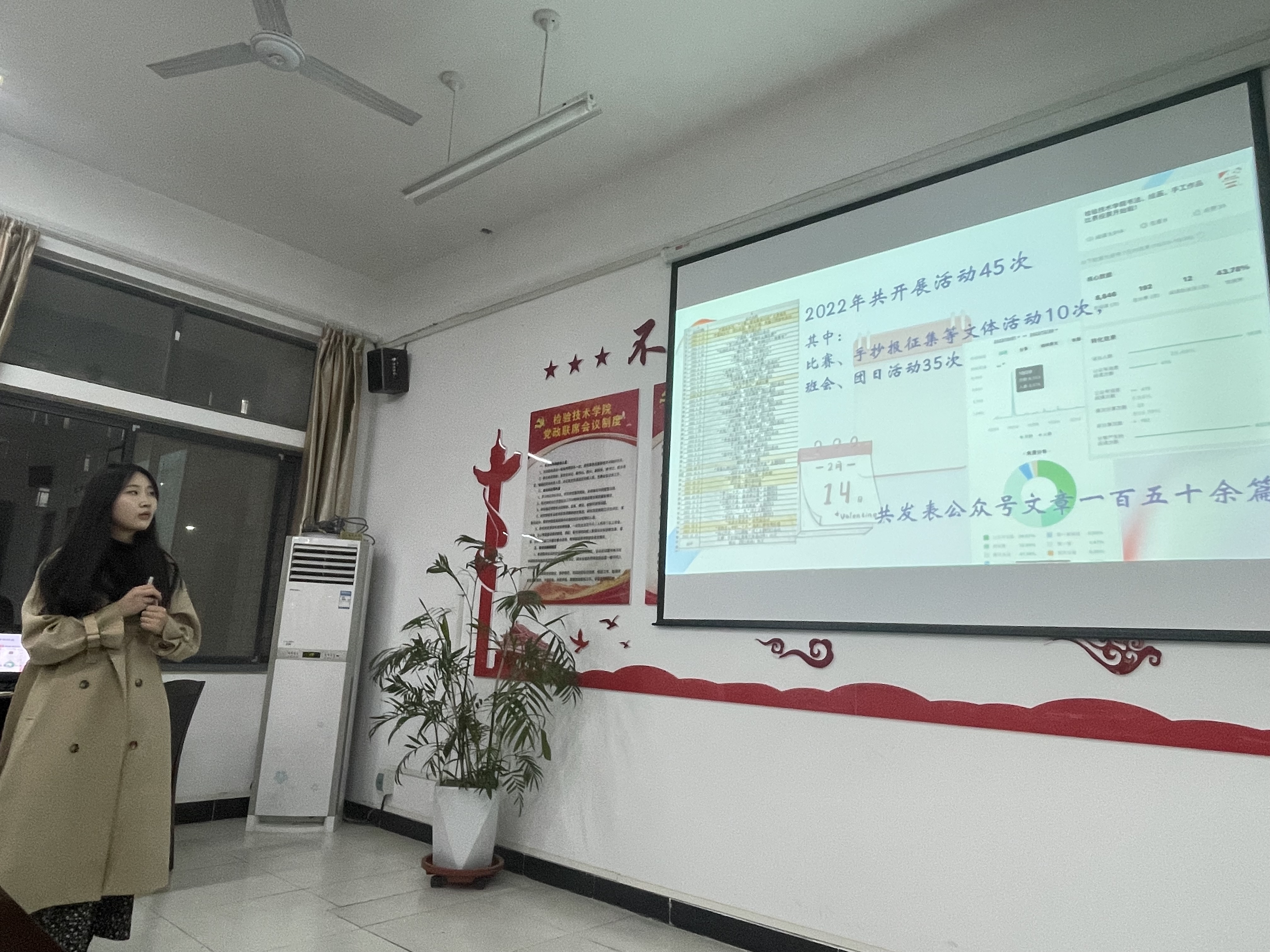 接着学生会各部部长围绕2022年主要工作内容、存在问题、后期计划等方面对工作述职汇报,团总支副书记、学生会执行主席刘莎莎进行2022年度团学工作汇报。孟书记充分肯定了大家的工作成绩,对团学干部的优秀成绩提出表扬。
