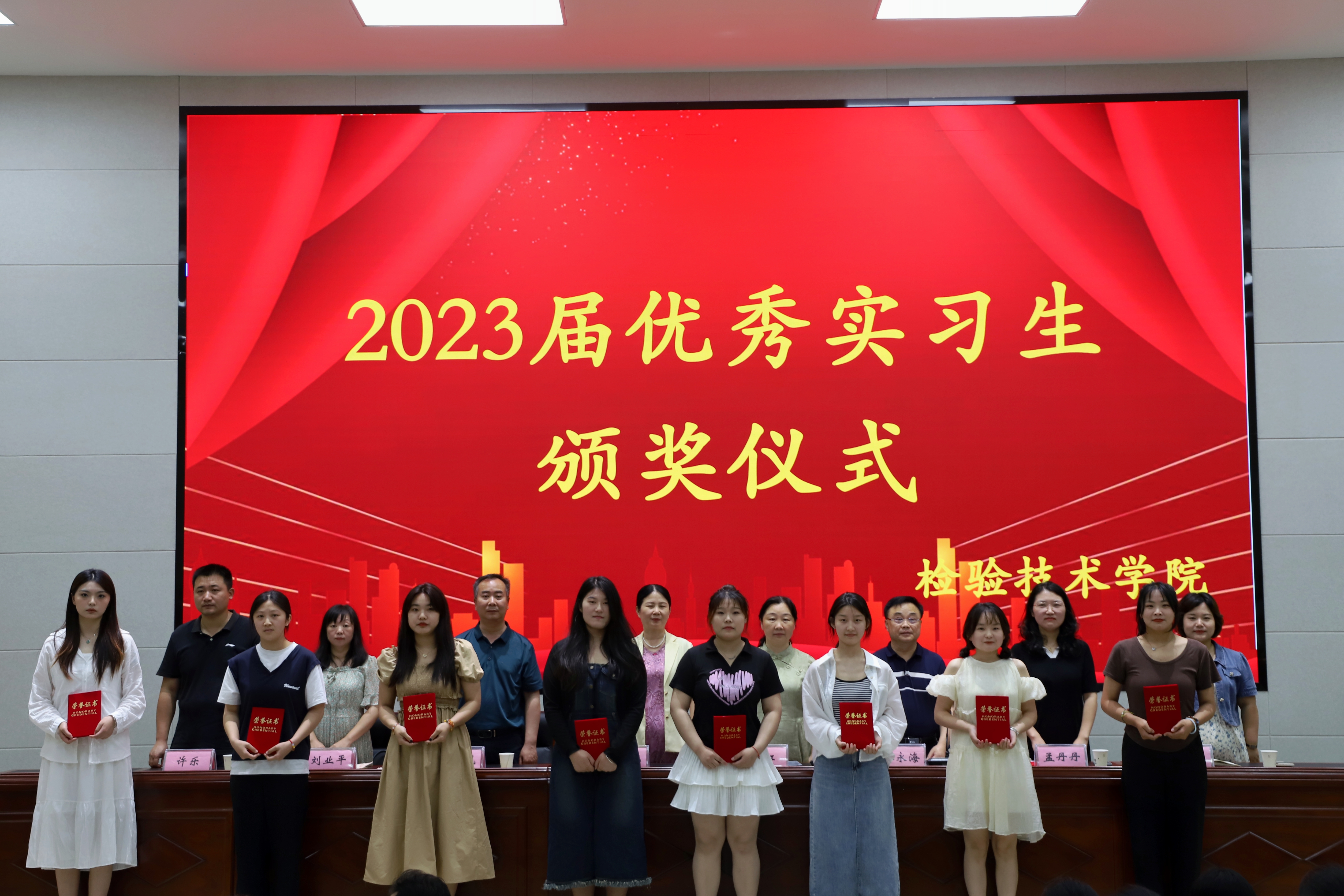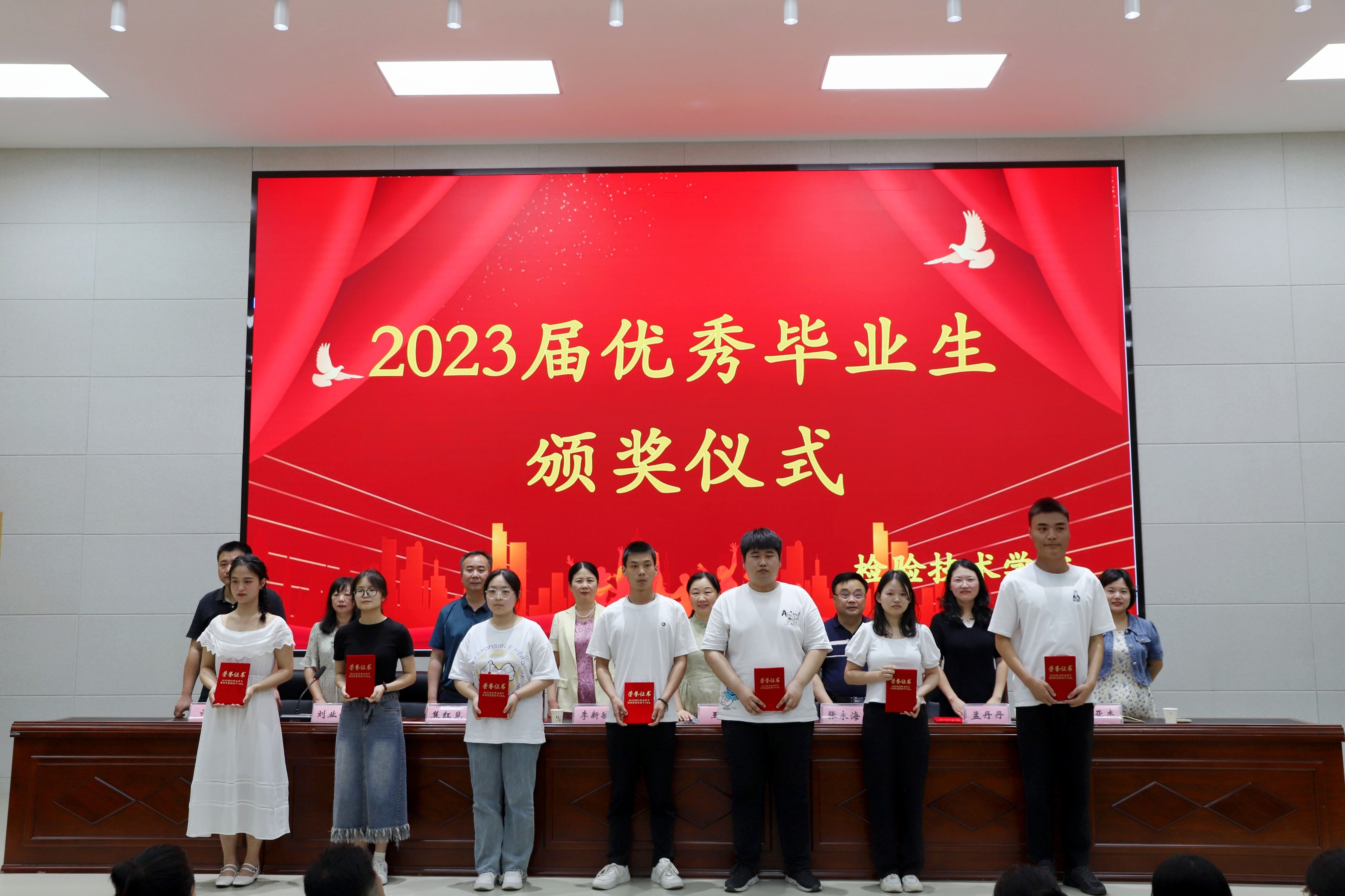 接着副院长张永海宣读2023届河南省优秀大中专毕业生、校级优秀毕业生、优秀实习生表彰名单。主席台上领导老师为获奖学生颁奖。
