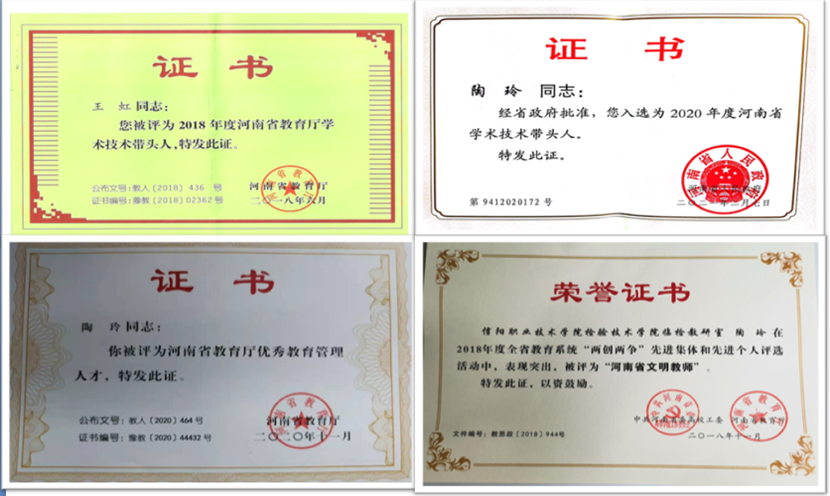金年会诚信信誉至上教学团队是省级教学团队,现有教职工36人,其中高级职称10人,双师型教师23人,拥有河南省学术技术带头人2人、河南省高等学校青年骨干教师1人、河南省高等学校青年骨干教师培养对象3人,河南省文明教师1人、信阳市拔尖人才3人、信阳市青年科技专家2人、信阳市优秀社科专家1人;建设有“河南省职业教育陶玲名师工作室”、“胡野名师工作室”(胡野教授为国家教育部卫生职业教育教学行指委委员、医学技术类专指委主任委员);参与完成教育部国家级教学和实习标准的研制项目3项,国家高等职业教育医学检验技术专业教学资源库建设,2021年被立项为河南省职业教育专业教学资源库建设项目,学院教师党总支荣获河南省首批高校省级样板党支部称号,获2021年度河南省职业教育优秀教学成果奖一等奖,2021年河南省高等职业教育青年教师课堂教学创新大赛一等奖;2022年专业核心课程《免疫学检验》获批河南省继续教育课程思政示范课。承担医学检验技术、卫生检验与检疫技术、药学、护理、临床医学等医学类专业的教学任务。