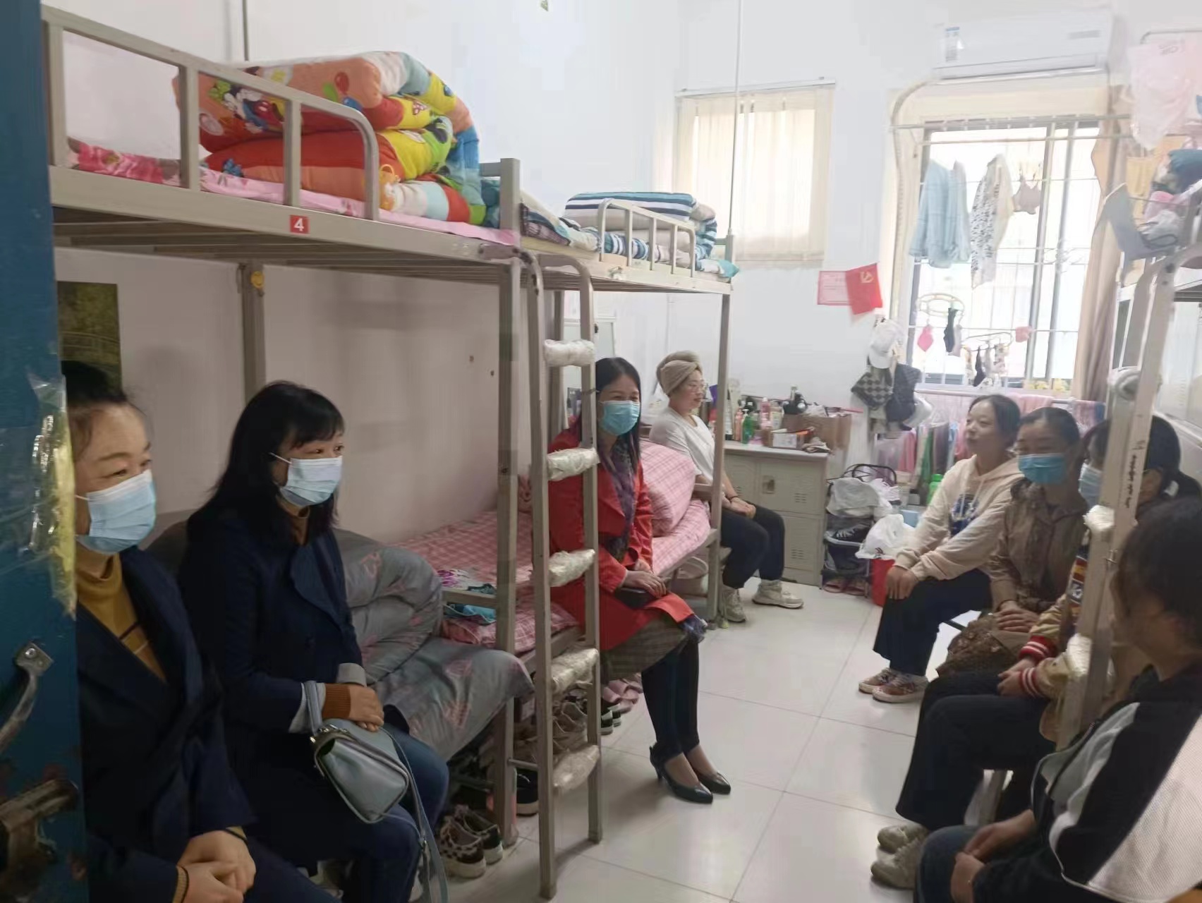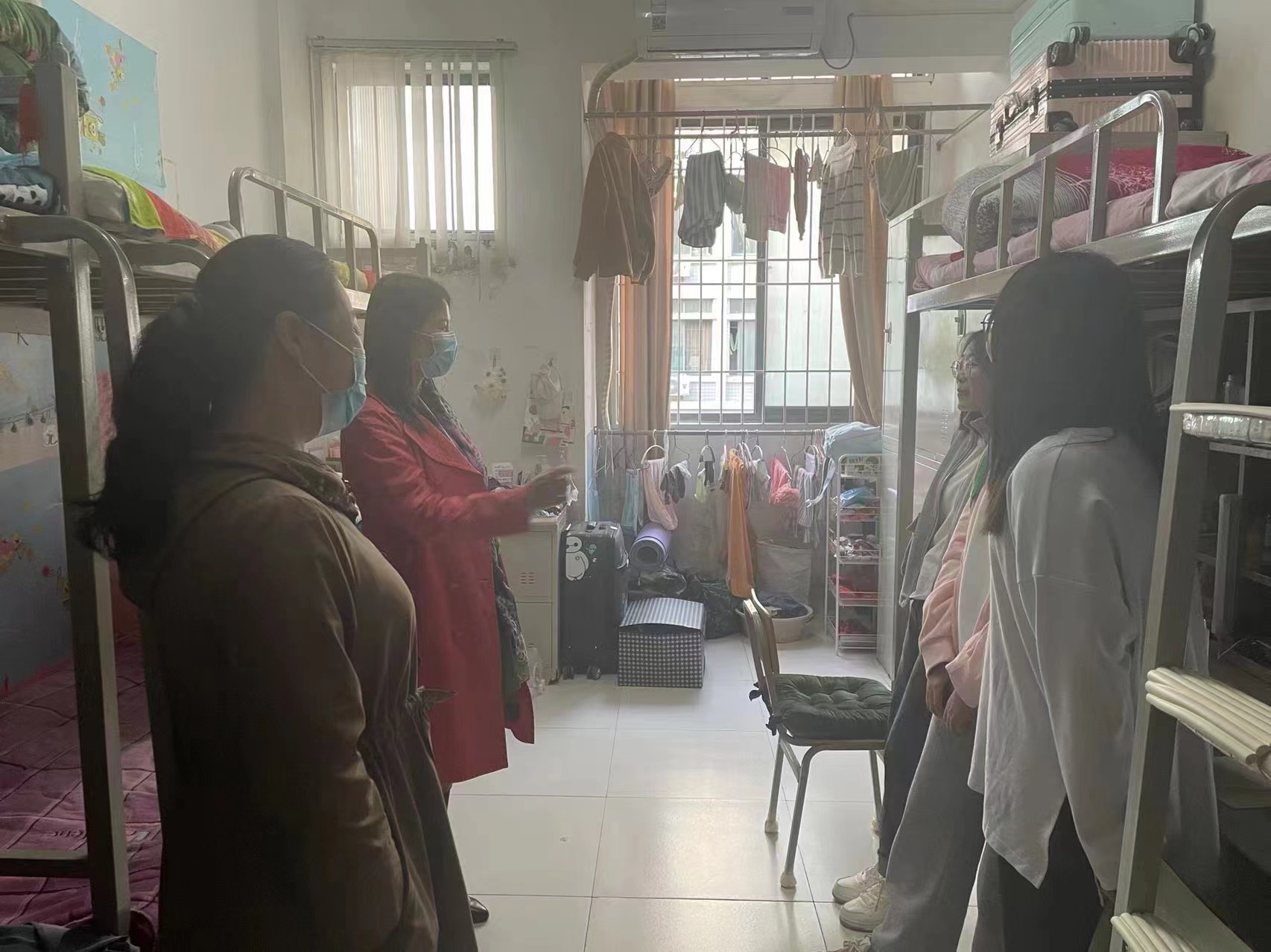 李新毓副校长来到学生宿舍询问同学们来校后的学习、生活状况,了解她们的思想动态,交谈中督促学生一定要保持良好的生活习惯、卫生习惯,要以饱满的精神状态投入到大学的学习当中。