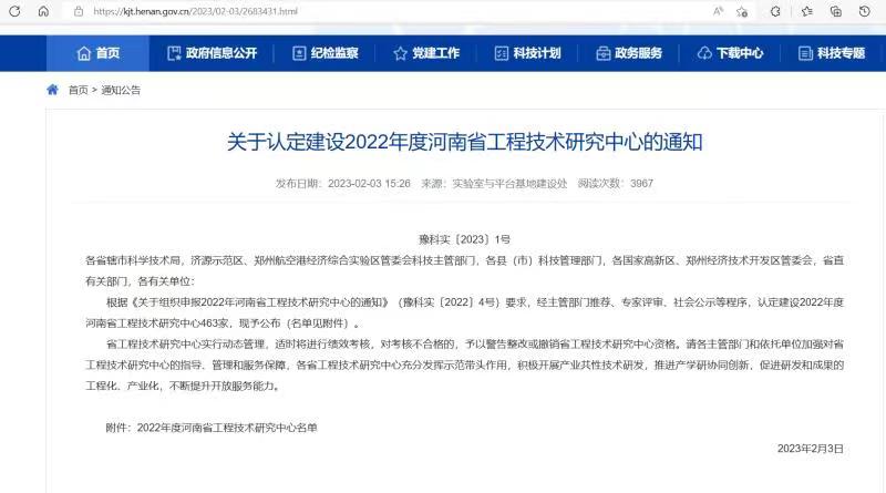 2月3日,河南省科学技术厅发布《关于认定建设2022年度河南省工程技术研究中心的通知》,认定建设2022年度河南省工程技术研究中心463家,金年会申报的“河南省茶叶农药残留检测工程技术研究中心”项目也在其中。
