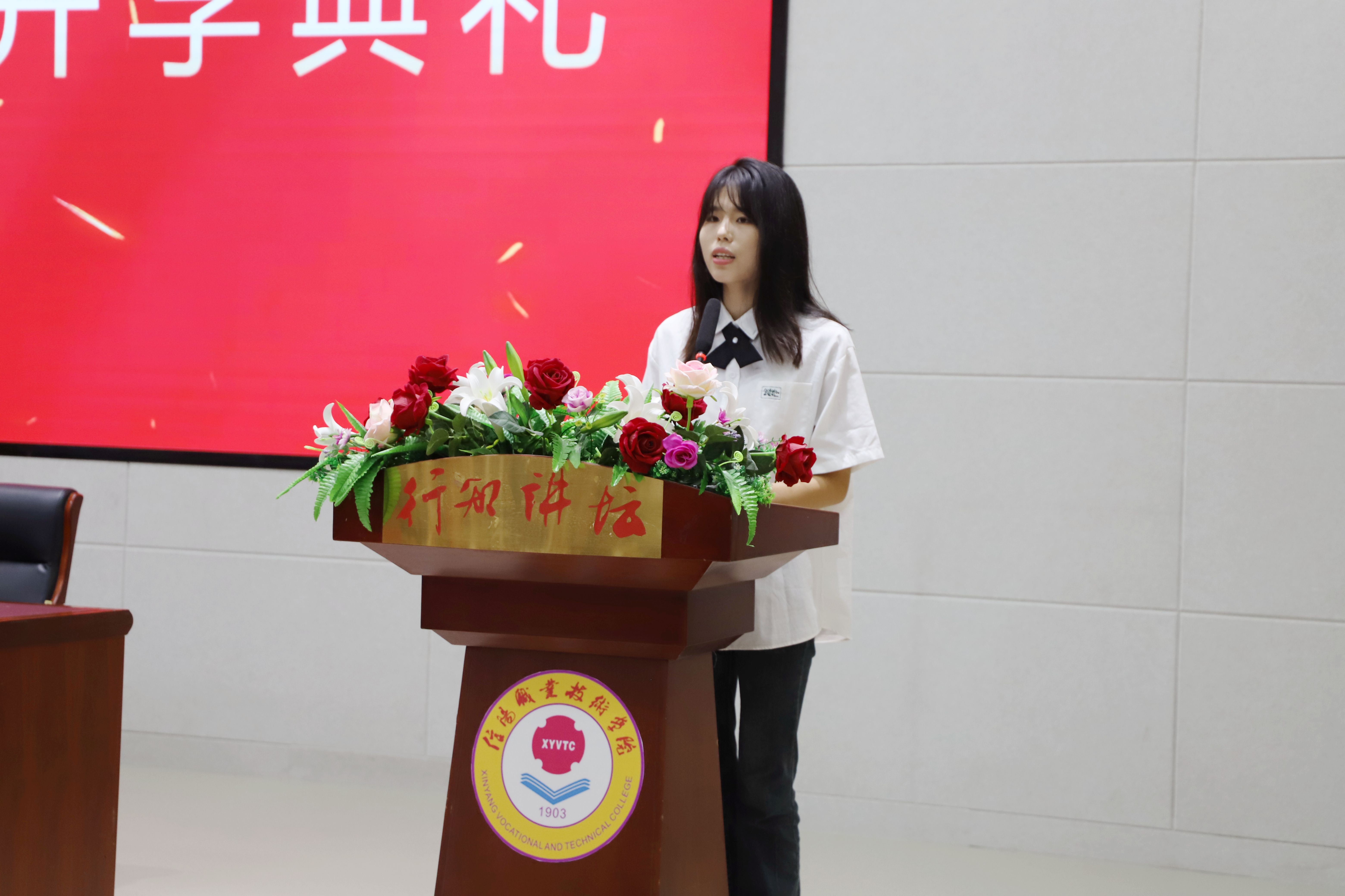 23级医学检验技术1班李怡静同学代表新生发言。初入校园她感受到学长学姐的热情接待,了解到学校诸多成就,她希望大家不忘初心,勇敢前行,不弃不馁,在信职检验这个崭新的舞台上大放异彩。